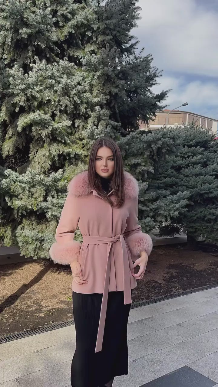 Hamida Blush Wool Wrap Coat with Luxe Fur Collar & Cuffs